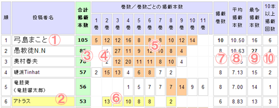 | 順 | 投稿者名 | 合計 掲載 本数 | 巻数/巻数ごとの掲載本数 | 掲載 巻数 | 平均 掲載 本数 | 最多 掲載 本数 | 10本 以上 掲載 回数 | |||||||||||