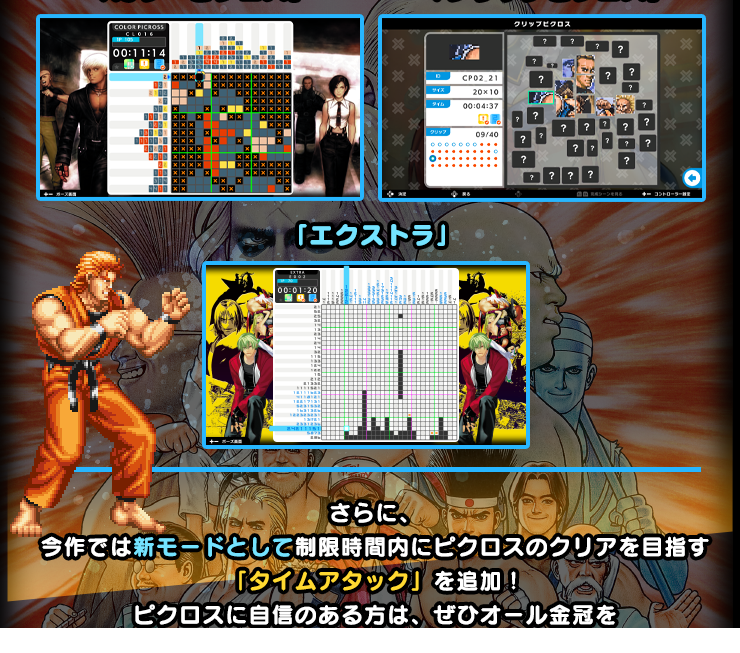 指定された個数のマスを消して絵を作るお手軽パズルで知られる「ピクセル」のSNKバージョンです。カプコンバージョンも同時発売されます。
