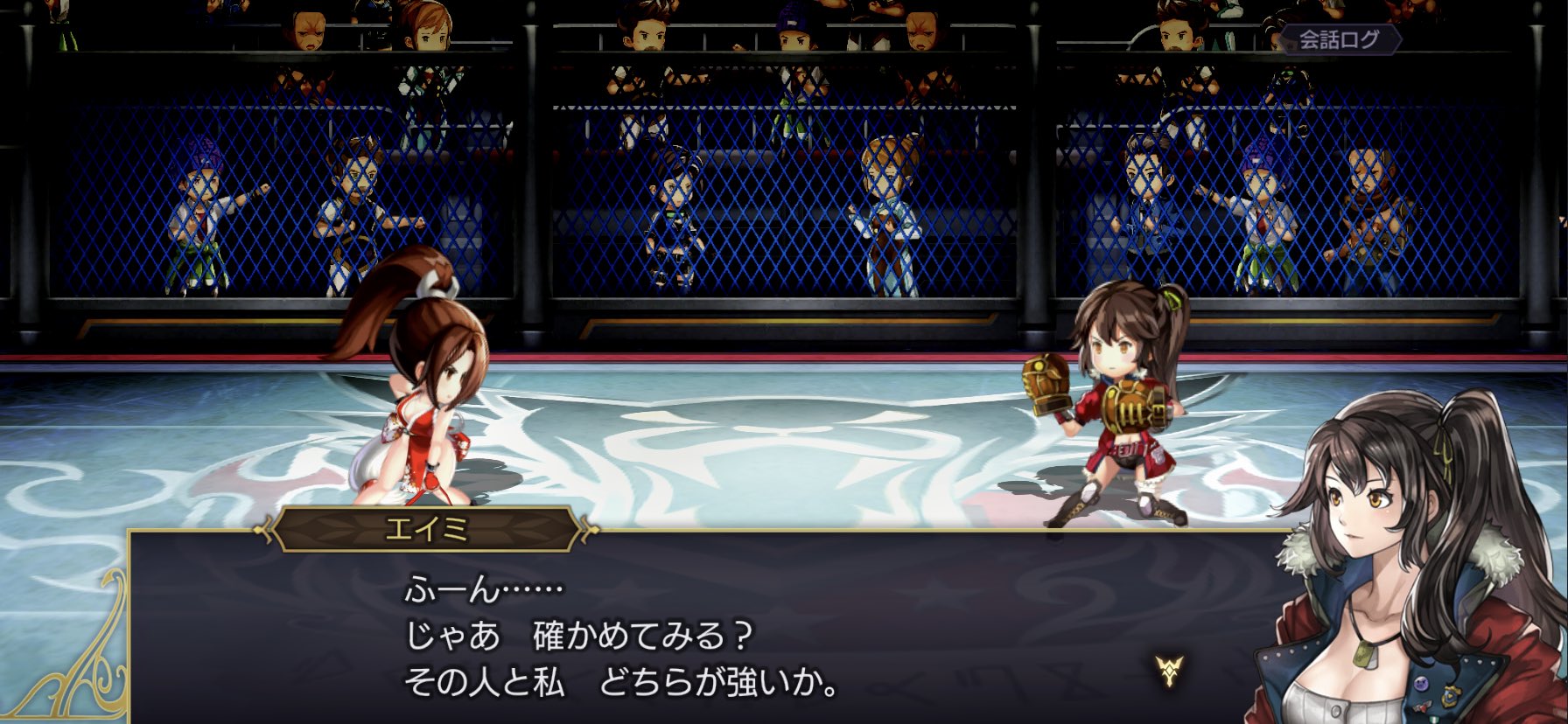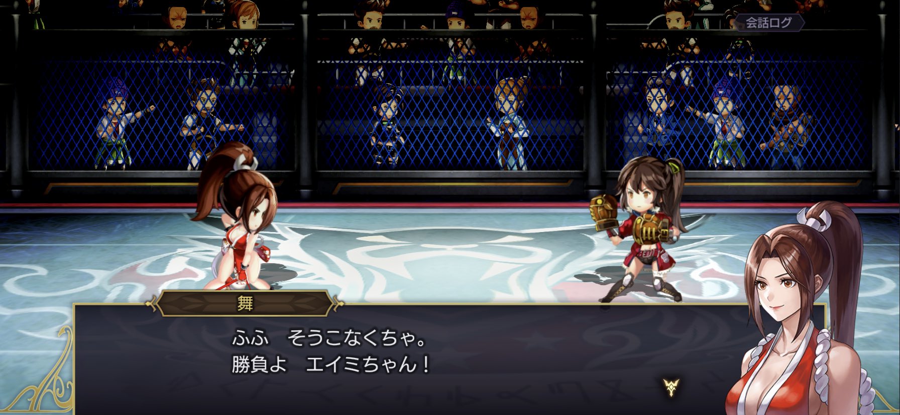 ユリは本作には直接登場はしませんが、「KOF」コラボで登場した不知火舞が、元気なファイター・エイミを相手に、ユリの印象を重ねてほっこりする場面が描かれています。